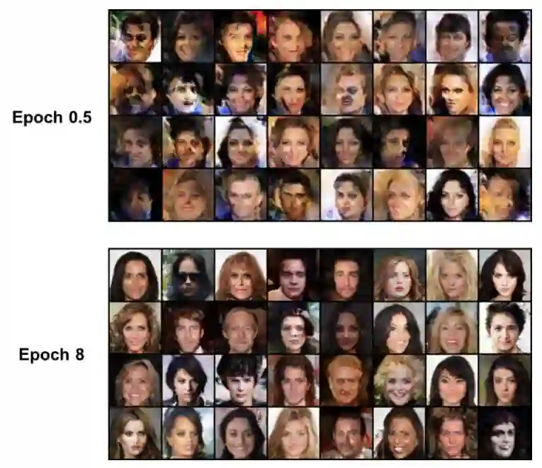 CelebA 数据集 (epoch on the left, 还在训练中):