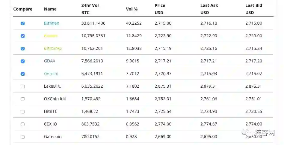 各大交易所 BTC/USD 的交易情况