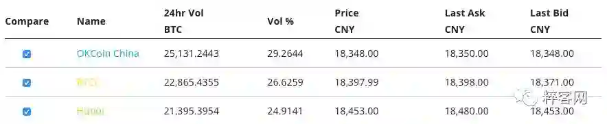 各大交易所 BTC/CNY 的交易情况