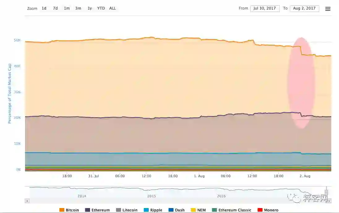 不过,分析市场中各加密数字货币的情况后你会发现,市场总值的上升与比特币或者说发展较好的竞争币(比如:以太币、瑞波币、莱特币)似乎无关,因为他们占据的市场份额都出现了下滑迹象。这意味着,市场总值的上涨与中小型加密货币具有密不可分的联系。