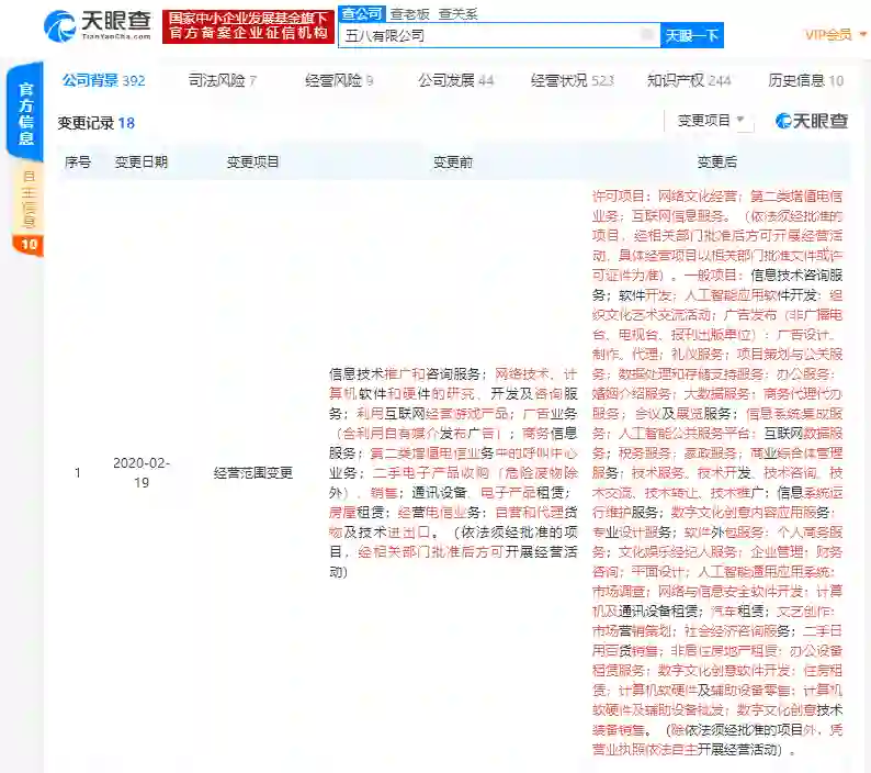 58同城全资子公司经营范围变更,新增人工智能应用软件开发等