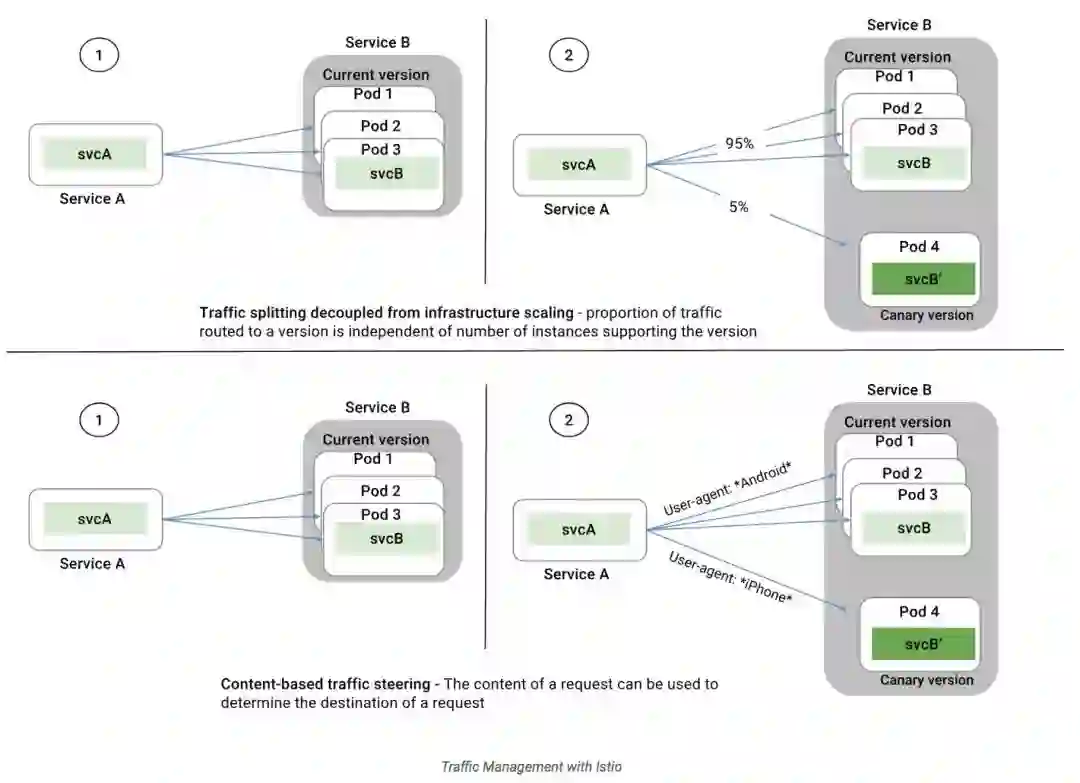 Pilot: 负责部署在service mesh中的Envoy实例的生命周期管理。本质上是负责流量管理和控制,是将流量和基础设施扩展解耦,这是Istio的核心。感性上,可以把Pilot看做是管理sidecar的sidecar, 但是这个特殊的sidacar并不承载任何业务流量。Pilot让运维人员通过Pilot指定它们希望流量遵循什么规则,而不是哪些特定的pod/VM应该接收流量。有了 Pilot 这个组件,我们可以非常容易的实现 A/B 测试和金丝雀Canary测试: