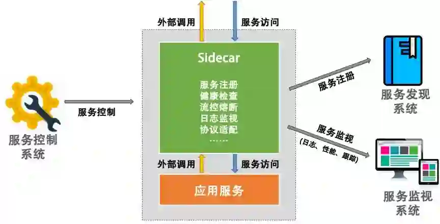该 sidecar proxy 负责接管对应服务的入流量和出流量。并将微服务架构中以前有公共库、framework实现的熔断、限流、降级、服务发现、调用链分布式跟踪以及立体监控等功能从服务中抽离到该 proxy 中: