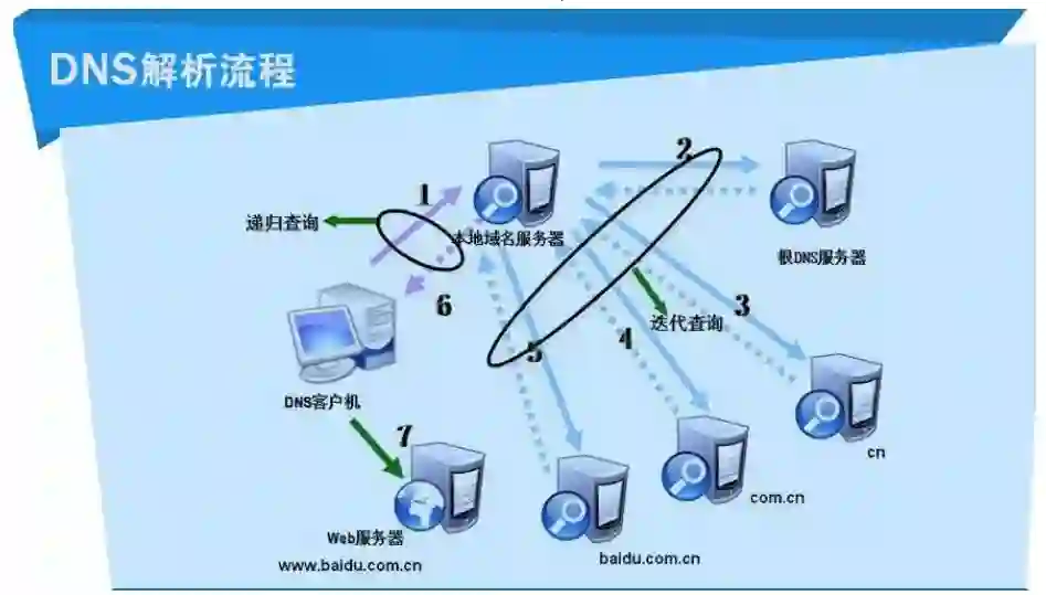 根服务器:ISP 的 DNS 服务器还找不到的话,它就会向根服务器发出请求,进行递归查询(DNS 服务器先问根域名服务器.com 域名服务器的 IP 地址,然后再问.baidu 域名服务器,依次类推)