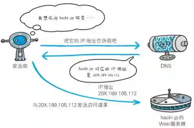 在浏览器输入网址后,首先要经过域名解析,因为浏览器并不能直接通过域名找到对应的服务器,而是要通过 IP 地址。大家这里或许会有个疑问----计算机既可以被赋予 IP 地址,也可以被赋予主机名和域名。比如 www.hackr.jp。那怎么不一开始就赋予个 IP 地址?这样就可以省去解析麻烦。我们先来了解下什么是 IP 地址