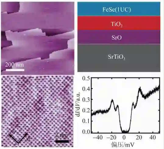 “单薄纤毫”的高温超导。优化制备方法后的FeSe块体最高Tc是9 K,高压下能达到 38 K,还能不能进一步提高?答案是肯定的。这需要小到 FeSe的“一根毫毛”——只有一个 Fe 和 Se 原子层的材料:FeSe 单原子层薄膜,简直是一层薄到无法再薄的薄膜。清华大学薛其坤研究组发现,如果把 FeSe单原子层薄膜镀在 SrTiO3衬底上,其超导能隙最大能达到 20 meV,Tc将可以突破65 K以上(图 5)!更神奇的是,如果镀上两个原子层的 FeSe薄膜,它就不超导了;如果镀在其他衬底如石墨烯等上,它也不超导!中科院物理所周兴江研究组以及复旦大学的封东来研究组等对其微观电子态的研究表明,单层 FeSe薄膜是电子型的铁基超导体,其物理相图和铜氧化物高温超导有所类似,SrTiO3衬底或许在载流子或电子—声子耦合方面帮助了超导的实现。上海交大贾金锋研究组的输运实验还说明,该材料有可能具有 100 K 以上的超导临界温度,虽未能进一步确认,但即便是 65 K也是铁基超导体中的最高记录了。至今,为何如此“单薄”的铁硒超导体具有如此之高的 Tc,仍然是一个谜团。单层FeSe的探索之路给科学家们许多重要的启示,寻找高温超导,或许可以“直捣底层”从原子层和界面上去设计材料,而不是单纯寻找块体材料的超导电性。