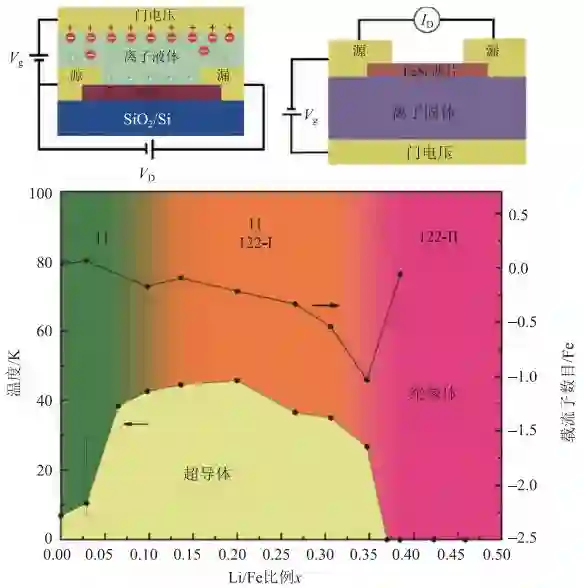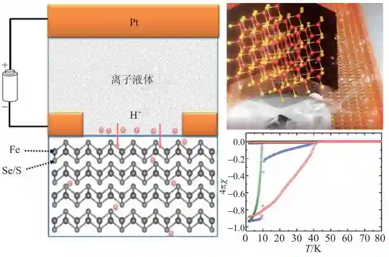 “流量可控”的超导电性。既然载流子浓度对 FeSe超导电性影响至关重要,如果绕开化学掺杂和高压,直接对其进行载流子浓度调控会如何呢?中国科大陈仙辉研究组率先开展了 FeSe超导体的离子门调控,该方法借鉴自半导体物理的研究。利用离子液体门电压调控可以在材料表面构造一层高电子浓度的结构,果不其然,FeSe薄层的 Tc从10 K 迅速提升到了 48 K。进一步,采用固体离子门技术,可以轻松地把 Li、Na 等固体离子注入到FeSe材料内部,不仅增强了超导电性,而且高浓度的离子注入使得体系变成具有 122 型的结构,最终走向了绝缘体的命运(图 7)。在 FeSe薄膜上通过离子液体的电场调控,同样可以实现 35 K 的超导电性。清华大学于浦和人民大学于伟强“二于合作”,采取了更为简单粗暴的电化学法,直接通过离子液体电化学把氢离子注入到样品体内。该方法同样成功调节了电子载流子浓度,把体系的超导电性大大提高,可谓是“氢我一下就超导”(图8)。