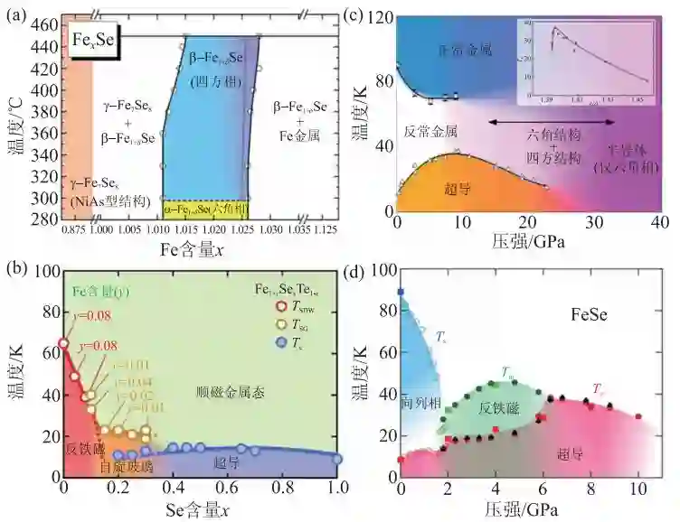 “蛛网交织”的物理相图。铁硒超导体的物理相图要比铁砷化物更为复杂,各种电子态就像蜘蛛网一样交织在一起。如前面所述,FeSe或 FeTe1-xSex的超导电性对剩余 Fe的存在极其敏感,而 KFe2Se2等又对Fe空位极其敏感,似乎只有 Fe:Se=1:1的时候,超导才能维持最佳状态(图 4(a),(b))。不仅是超导,反铁磁性在铁硒化物中也是如此,FeSe本身并不具有磁性,然而随着外界压力的增加,其超导临界温度会随之增加然后再减小,在 2 GPa 压力下的超导区之上,反铁磁性突然出现了。这种反铁磁结构与铁砷化物母体中极为类似,超导 Tc最高能达到 38 K,反铁磁转变温度 Tm最高能 达 到 45 K( 图 4(c), (d))。 这 种“凭空出现”的反铁磁区非常令人困惑,关于它的起源理论上有许多猜测,目前实验尚无统一结论。
