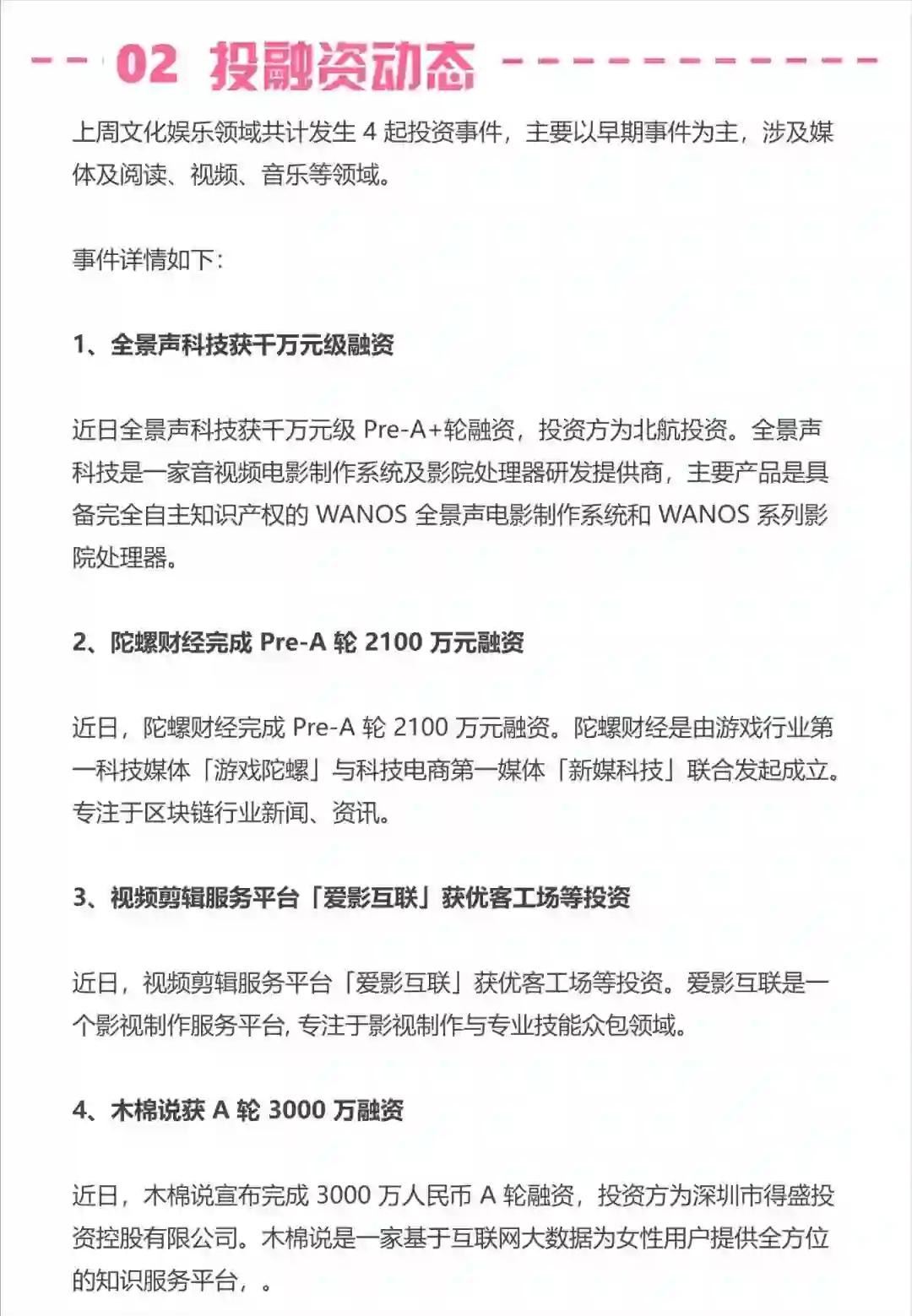 作为互联网创投数据服务商,IT桔子也持续关注文娱行业,推出文娱周报栏目。新栏目将汇总每周创投数据,通过数据解读,为大家还原上一周文娱行业的动态与风向。