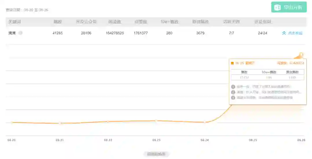 而在微信公众号平台,在新榜日常连续监测的63万微信公众号中,过去两天,共有超过1.89万篇文章写到滴滴事件,这其中,有1731篇原创内容,共诞生了220篇10w+爆文。