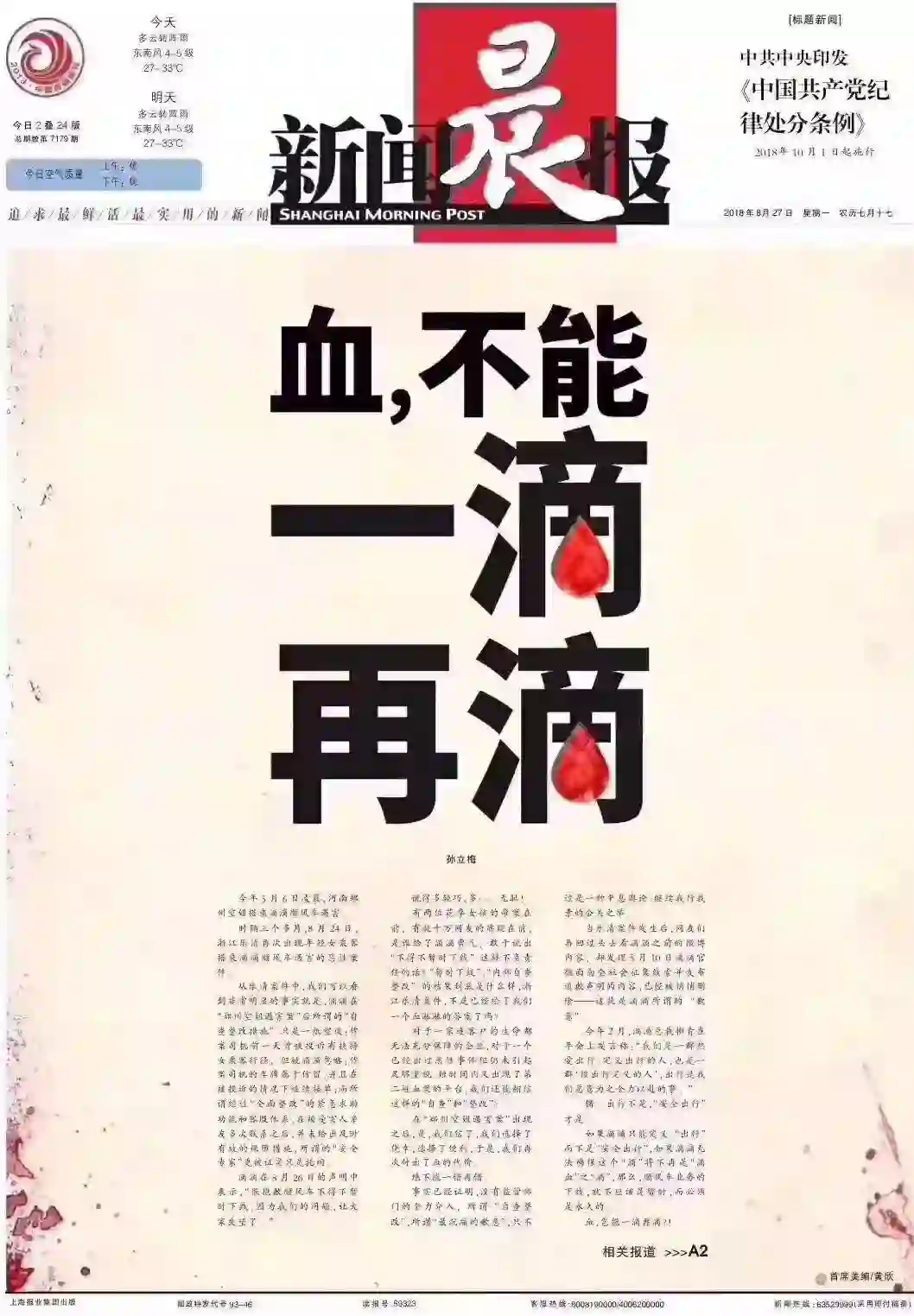 于是,新闻晨报今日份“血,不能一滴再滴”的头版图片很快在社交媒体传开。