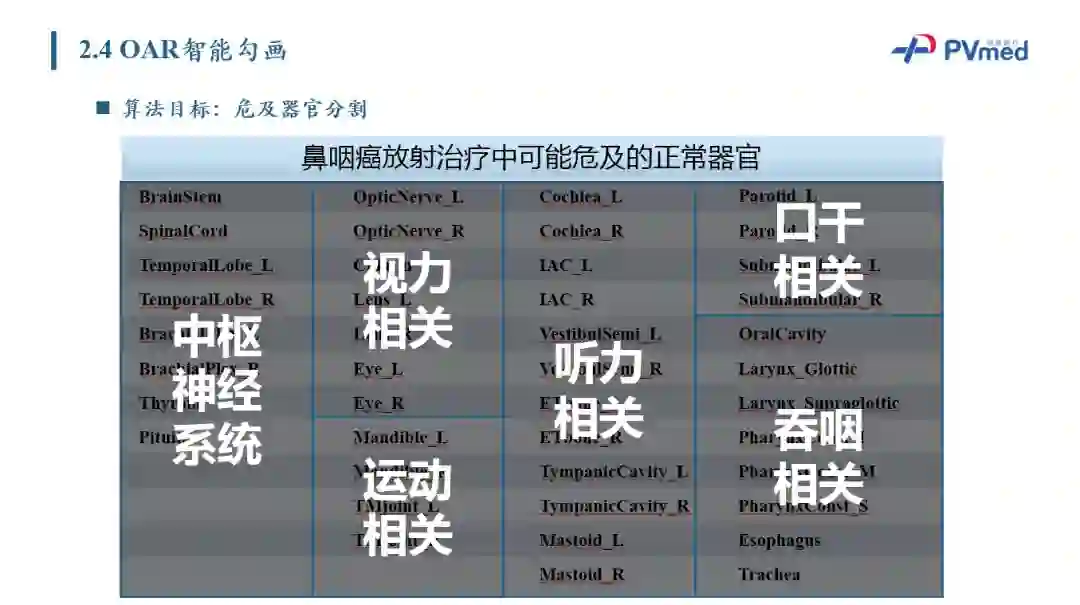 放疗会出现口干(进食困难)、放射性脑脊髓病等并发症,主要一大原因即危机器官受到影响。针对鼻咽癌放疗的临床需求,柏视大概共分割出临床上需要保护的43个器官,包括中枢神经、视力、运动、听力、口干和吞咽相关的六大部分器官,据调研,目前关于上述器官分割报道并未出现。
