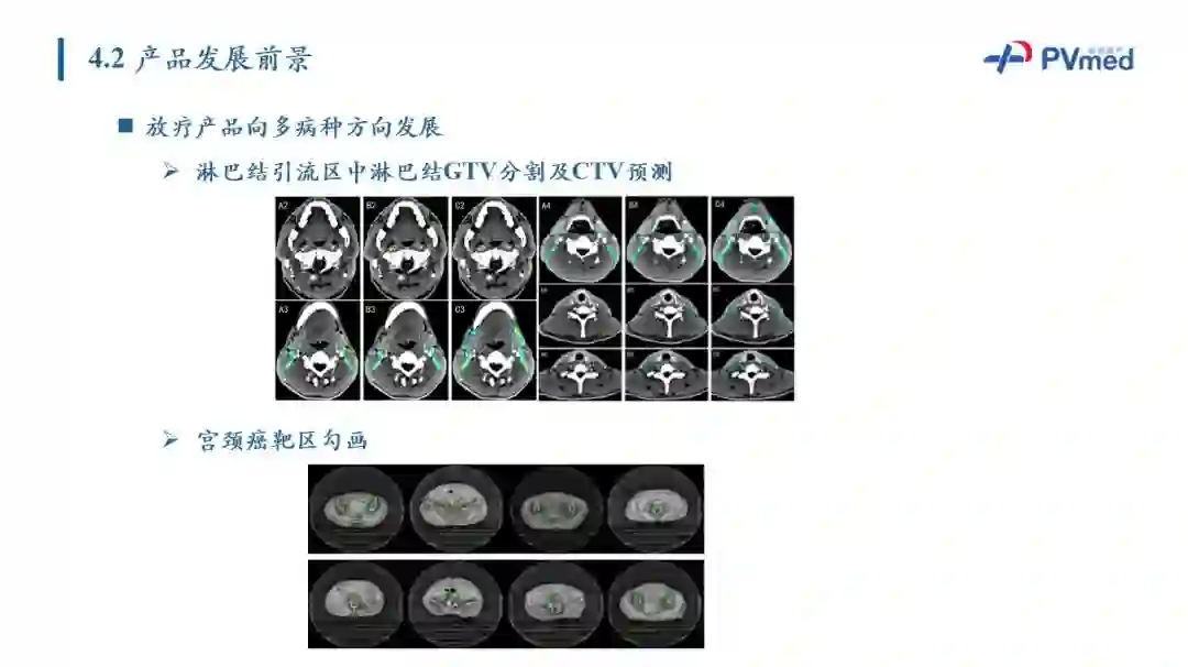 其次是放疗靶区勾画产品的趋势,即多病种的靶区勾画是主要产品拓展方向。柏视已经开始进行淋巴结引流区中淋巴结GTV分割及CTV预测,且目前已有较好的工作。这里展示的是淋巴结引流区的典型层面中不同组别淋巴结的分布的概率。