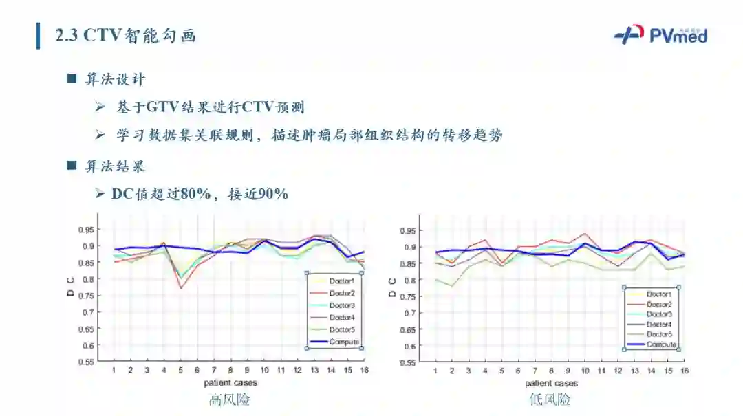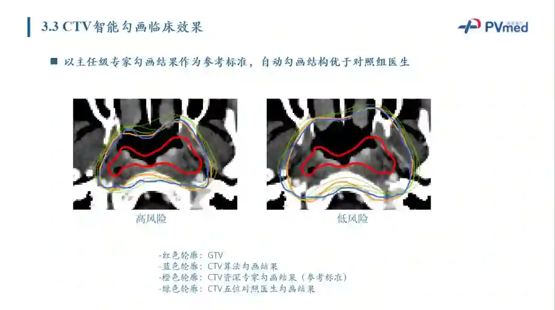 对于CTV预测临床效果,在图中可以看到,无论是高风险还是低风险的CTV预测,预测结果和参考的资深医生勾画的CTV轮廓是基本一致的。 相较于资历较浅医生所勾画的CTV,自动预测的CTV精准度高于对比医生的平均水平。