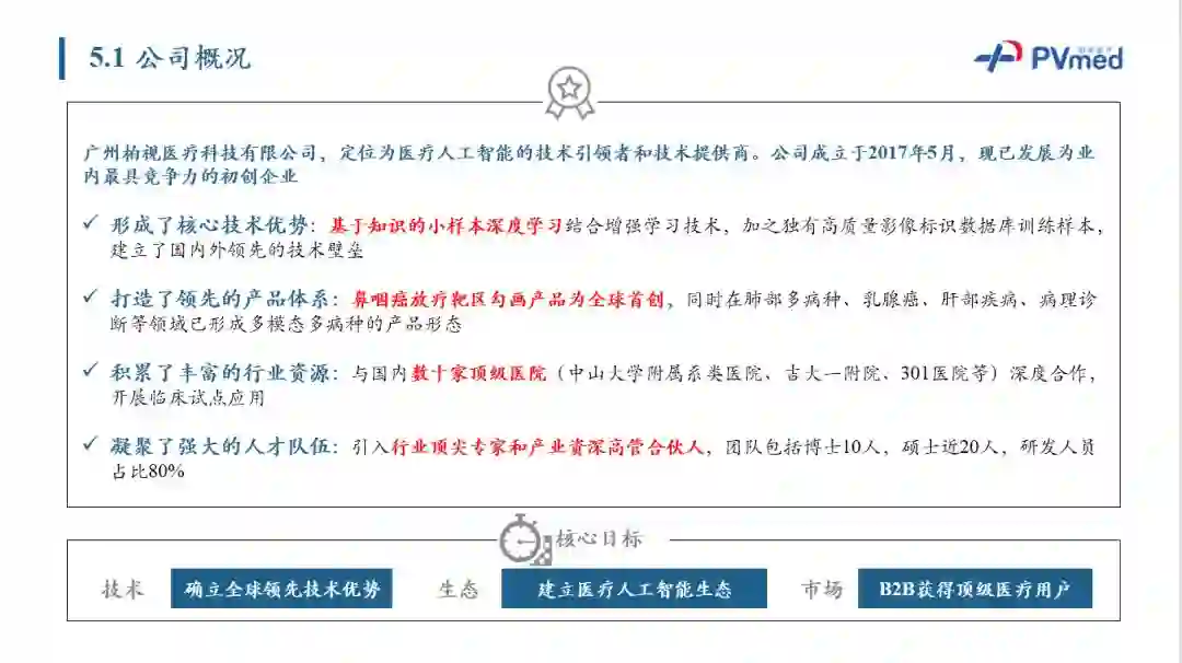 最后简单介绍柏视医疗科技有限公司。柏视定位于医疗人工智能技术引领者和技术提供商。公司成立于2017年5月,现已发展为业内最具竞争力的初创企业。公司形成了核心技术优势,同时也打造了领先的产品的体系。目前柏视医疗以放疗为主,形成一个多模态多病种的产品体系,打通了影像、病理、放疗科,从而真正实现了从诊断到确诊到治疗的数据流和工作流。