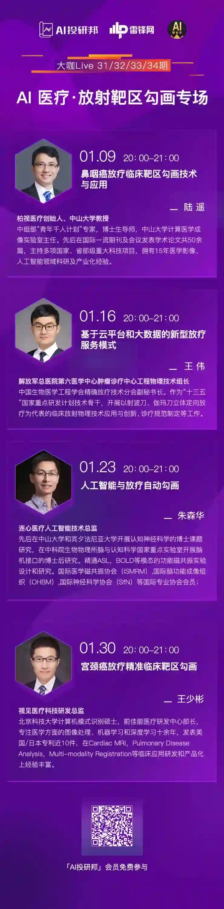 本系列课程的最后一期,将于1月30日(本周三)晚上八点开讲。届时视见医疗科技研发总监王少彬将分享他在鼻咽癌、宫颈癌两个病种的放疗靶区勾画中的技术探索与实践。欢迎扫描下方图片中的二维码关注课程。「AI投研邦」会员免费参与直播或收听音频版。