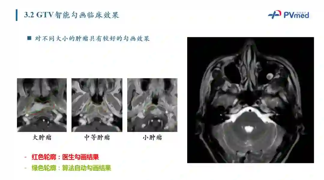 从GTV规划的临床效果来看,左侧展示了对于大中小尺度的肿瘤算法都能够有比较好的勾画的效果,右侧是对患者的GTV勾画结果动态展示。和医生勾画的轮廓线相比较的话,算法分割的结果在Z轴方向有较好的三维连续性,在病灶首尾两端存在一定的分割误差,这也是由医生在病灶首尾两端存在不同的勾画分割所造成的。