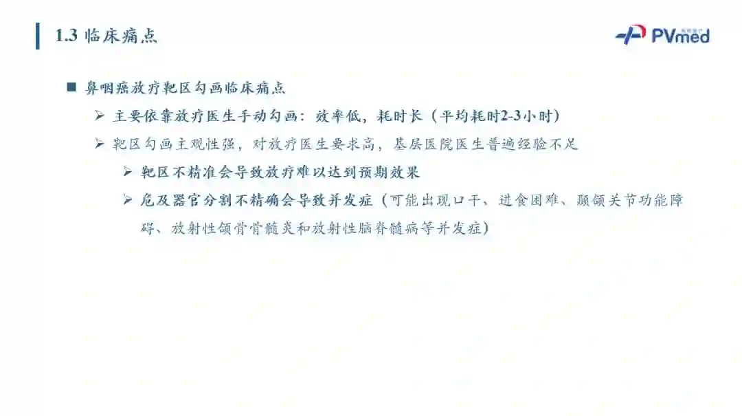 鼻咽癌放疗靶区勾画另一临床痛点即靶区勾画主观性强,对放疗医生要求高。基层医院医生普遍经验不足,独立完成靶区勾画较难。这会导致两方面的问题:一方面即靶区不精准会导致放疗难以达到预期效果;第二方面即危机器官分割不精确、对危机器官过量照射会导致并发症。譬如可能出现口干、进食困难、颞颌关节功能障碍、放射性颌骨骨髓炎和放射性脑脊髓病等并发症,这会影响病患生活的质量。