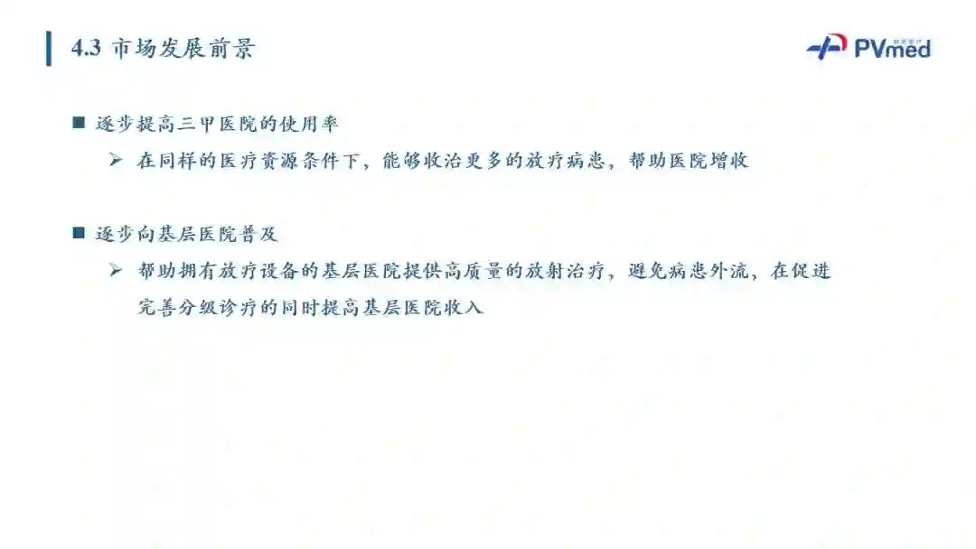 另一方面,放疗市场近年来也在不断的增长,国内放疗市场年复合增长率约为25%,2015年已达269亿。目前放疗采用率还处于较低水平,随着放疗采用率的逐步提高,放疗市场还有较大的上升空间。如果放疗采用率达到理论推荐的70%,我国放疗的市场空间则将达到800 亿。总体来看,放疗靶区勾画的市场发展方向非常好。作为提供靶区勾画产品和服务的企业而言,它更重要的是把握市场拓展的路线和方向。一方面逐步提高三甲医院的使用率,在同样的医疗资源条件下,能够收治更多的放疗病患,帮助医院增收。另一方面,逐步向基层医院普及,帮助拥有放疗设备的基层医院提供高质量的放射治疗,避免病患外流,在促进完善分级诊疗的同时提高基层医院收入。