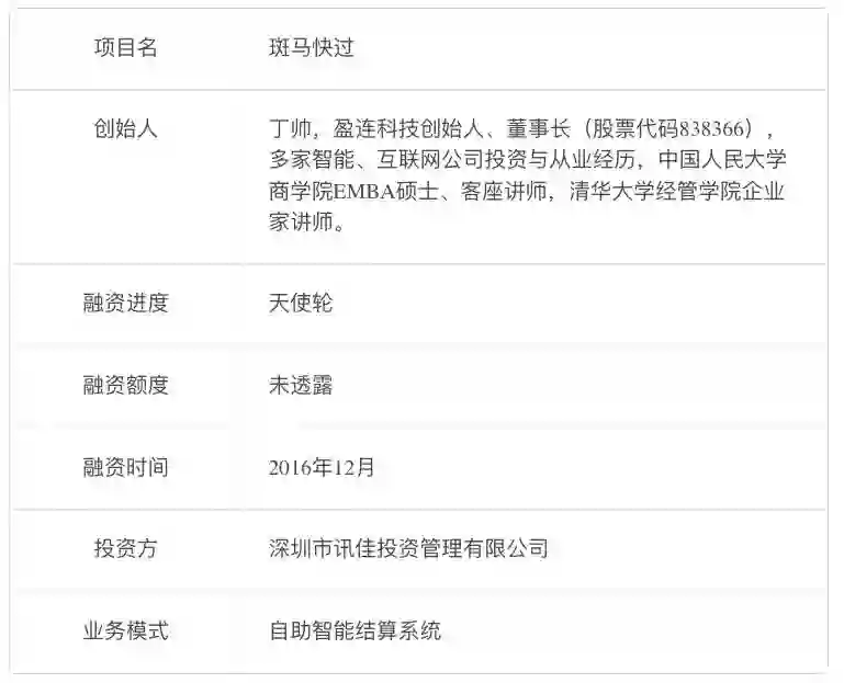 目前,斑马快过正在寻求Pre-A轮融资。去年12月,斑马快过已获得天使轮融资,投资方为深圳市讯佳投资管理有限公司。