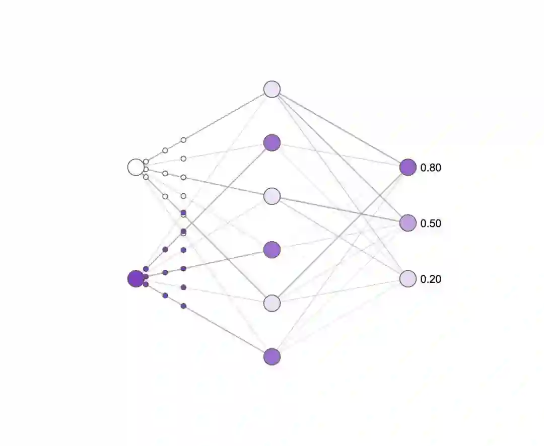 删除神经元对简单神经网络影响的直观图示。颜色较深的神经元更加活跃。尝试点击隐藏层中的神经元并删除它们,观察输出神经元的活动会如何改变。请注意,删除一个或两个神经元对输出影响很小,而删除大部分神经元则会对输出影响很大,并且一些神经元比其他神经元更重要!
