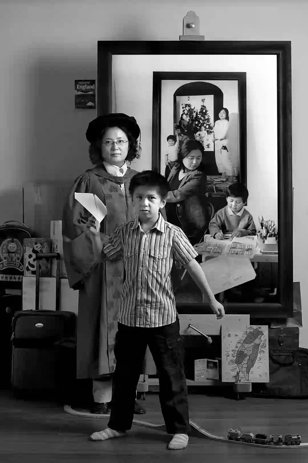 我们一直在搬家,从英国搬到台湾,然后回台湾又要搬家,随时都在打包。照片的右后方是一幅台湾地图,那是我小时候玩的拼图,代表着我过去认识的台湾,左后方则是一堆我们日常的行李箱,那时,我们需要带着旅行箱去重新认识台湾。旅行箱旁边还有一个桶,那里都是他折的飞机。