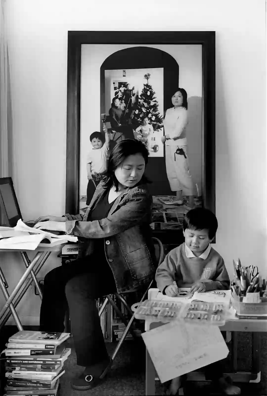 我很痛苦,甚至觉得有点火大,但后来一想,过去的妈妈也是这样,这边织衣服、修改衣服,小朋友也在旁边读书或怎样,所以我们就一起用功吧,所以这张照片就叫“用功“。