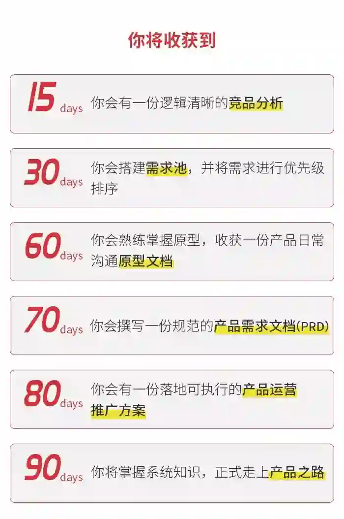 你将逐步掌握: 一个产品从想法到功能再到效果的整个过程的工作内容,系统的产品知识;掌握竞品分析、Featur list、产品原型、产品需求文档、运营推广方案等产品文档的规范写法;积累面试作品,快速上手产品工作。