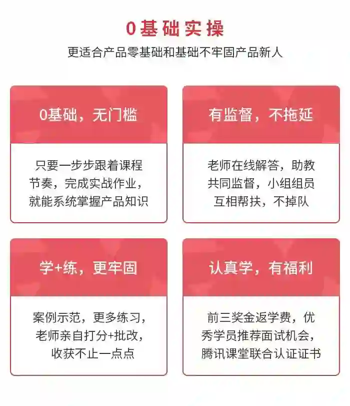 由腾讯课堂和起点学院联合打造的“90天产品经理实战班”,是适合产品零基础及产品基础不牢固同学的系统化产品经理课程。
