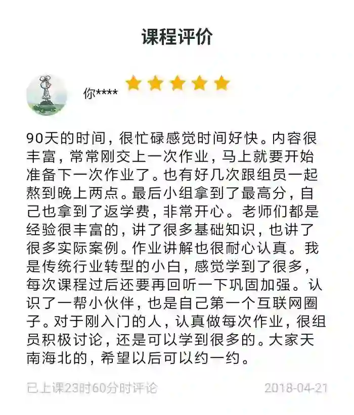 在这个学习中,我获得了第1名成绩,优秀小组长和优秀团队的称号。实际奖项不重要,我学习到的知识内容对我来说才是最最宝贵的。我会凭借着学习到的知识,尝试产品经理的岗位,打破我当前工作给我设置的天花板,追求新的发展!