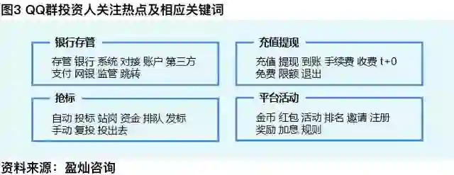 根据上表及其余关键词数据,我们基本可以推断出QQ群投资人关注点集中在银行存管、充值提现、抢标困难、平台活动等方面。
