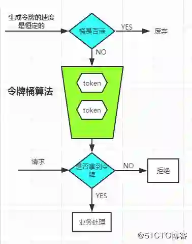 生成令牌的速度是恒定的,而请求去拿令牌是没有速度限制的。这意味,面对瞬时大流量,该算法可以在短时间内请求拿到大量令牌,而且拿令牌的过程并不是消耗很大的事情。(有一点生产令牌,消费令牌的意味)