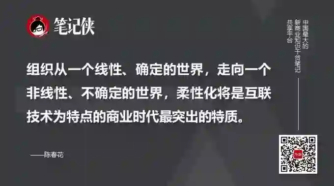 组织从一个线性、确定的世界,走向一个非线性、不确定的世界,柔性化将是互联技术为特点的商业时代最突出的特质。
