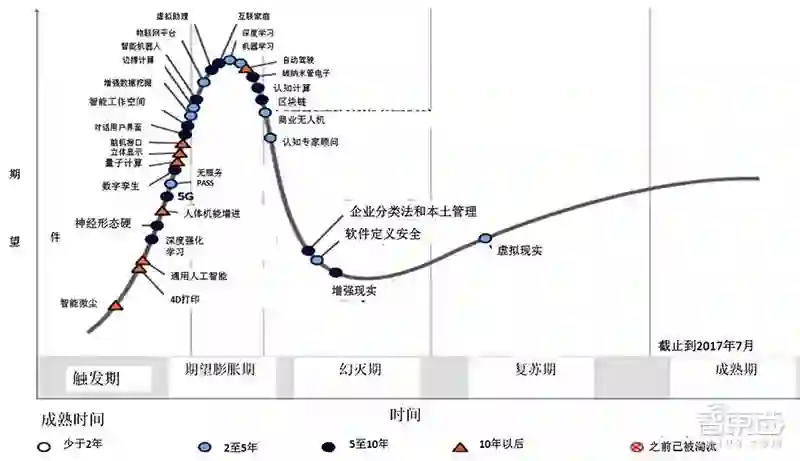 根据最新Gartner新兴技术成熟度曲线,智能机器人、认知专家顾问、机器学习、自动驾驶汽车等AI智能热门技术正处于“期望膨胀期”,接下来可能进入“幻灭期”。