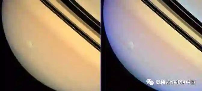 Waldmann和Griffith利用人工智能分析了这场长达数月的土星电风暴的数据。左图显示的是与肉眼看到的颜色相似的行星,而右图则是颜色增强版,风暴更加清晰可见。图片来源:NASA/JPL/空间科学研究所