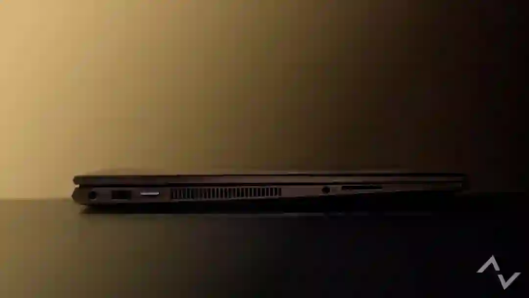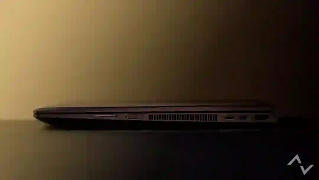机身右侧分别是音量按钮,指纹识别传感器,散热口,两个支持雷电的 Type-C 接口和一个 HDMI 接口。在如此轻薄的机身下,惠普仍然提供了丰富的接口,尽可能地满足用户在不同场合的扩展性需要。
