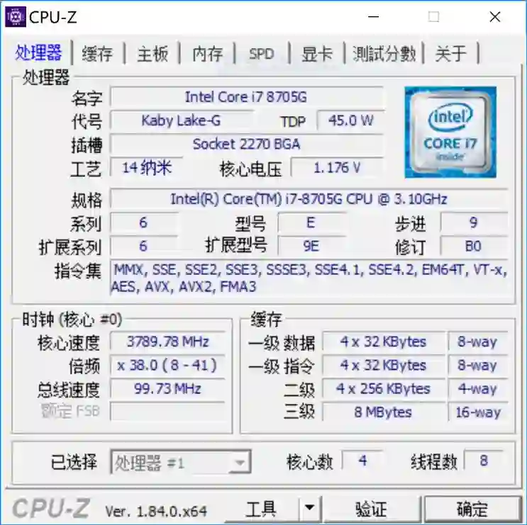 (注:因为 i7 8705G 处理器刚刚推出,CPU-Z 的 TDP 数据有误)