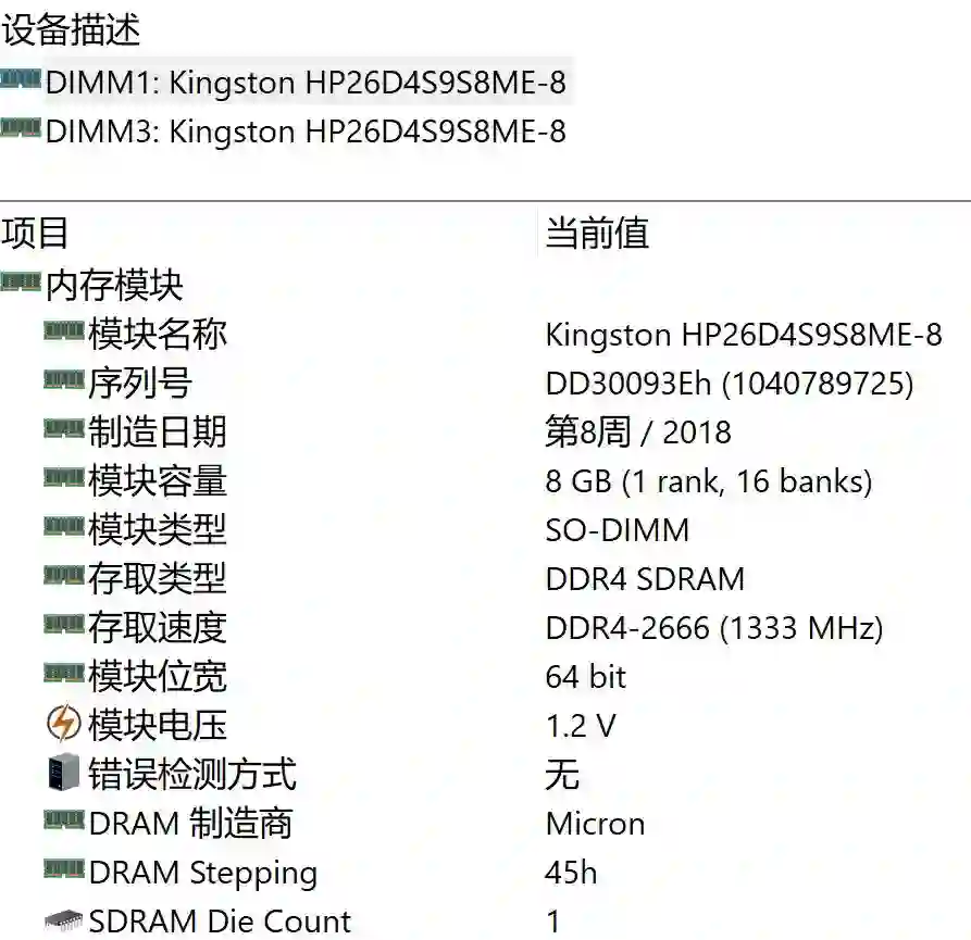 在内存方面,Spectre x360 15 选择了来自金士顿的双条 8GB DDR4 2666 内存,采用的是镁光颗粒。