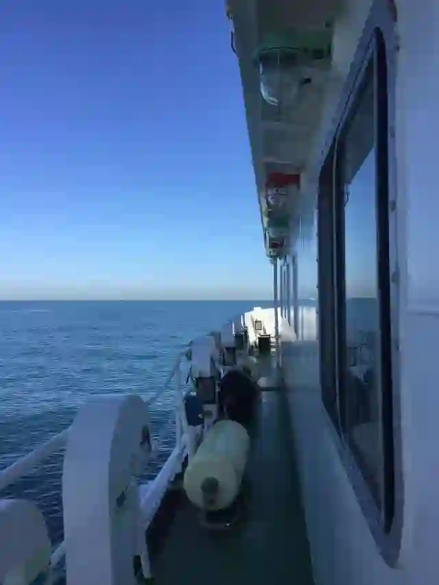 然后我们走出来,沿着船舷上楼梯。