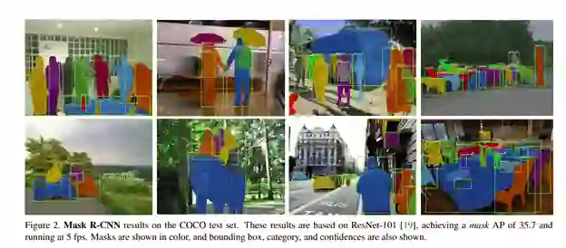 在这个架构中,使用边界框和语义分割将每个像素划分为一组类别,对对象进行分类和局部化。对每个感兴趣的区域得到一个分割掩码,生成一个类标签和一个边界框作为最终输出。该架构是Faster R-CNN的扩展。Faster R-CNN由regions proposer和深度卷积网络和利局部检测器组成。这里是COCO测试集中的一张图像的结果: