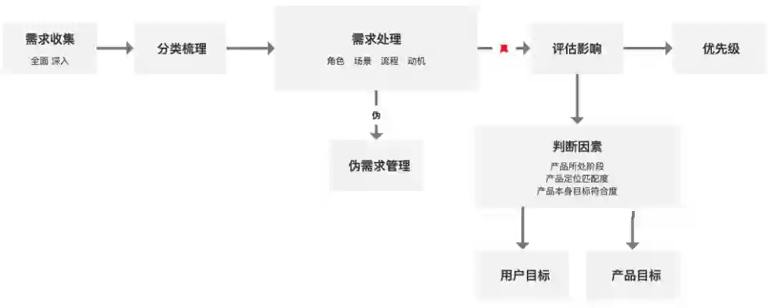 一条完整的需求分析链路是从需求的收集到最后的需求优先级确定的过程。需求收集的来源需要全面与深入。其实产品工作中时常会遇到诸多需求,有来自竞品、行业、市场的分析,也有来自各个渠道的用户反馈、其他前线部门的反馈等。多渠道的需求来源保证了需求全面深入,但同时也使需求纷繁复杂,因此对需求进行分类梳理,进行有效管理便显得十分重要了。需求收集后需要根据实际需要进行分类梳理,比如产品的业务线,产品的发展阶段规划等。对需求的分类梳理其实也体现着产品经理的管理与架构能力。当面对诸多需求的时候,对需求进行处理后才能辨别真伪以及需求的本质。书中关于需求的处理大致可以归纳为角色、场景、流程以及动机。