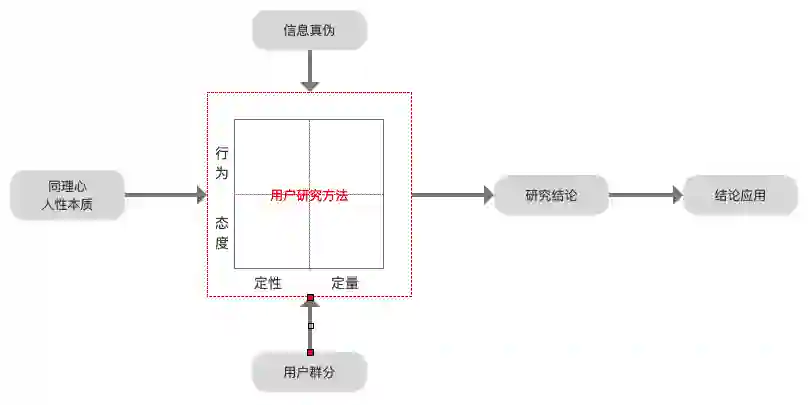 用户研究的内核为用户研究方法矩阵,结合特定的用户研究方法,比如焦点小组、问卷调查、可用性测试、眼动分析以及行为分析等,通过从定性到定量,从用户态度到用户行为,进行合目的性的用户研究。