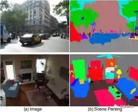 然后,我们再来简单介绍一下实际场景中物体的尺度信息。以下图为例,包含室内与室外两个场景及其对应的语义标签。从图中可以看到:部分物体具有非常大的空间形式(比如建筑物、树以及沙发),部分物体具有非常小的空间表现形式(比如行人、书本等)。甚至同一物体具有非常大的可变的空间变现形式(比如室外场景中的汽车)。