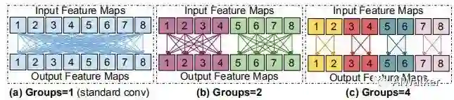 为使PyConv在不同层使用不同深度的卷积核,需要将输入特征划分为不同的组并独立的进行卷积计算,称之为组卷积(见下图示例)。不知各位有没有觉得这个思想跟谷歌的MixNet思想非常相似,MixNet中也是采用了类似组卷积方式进行不同尺寸卷积核计算,文末附对比分析。