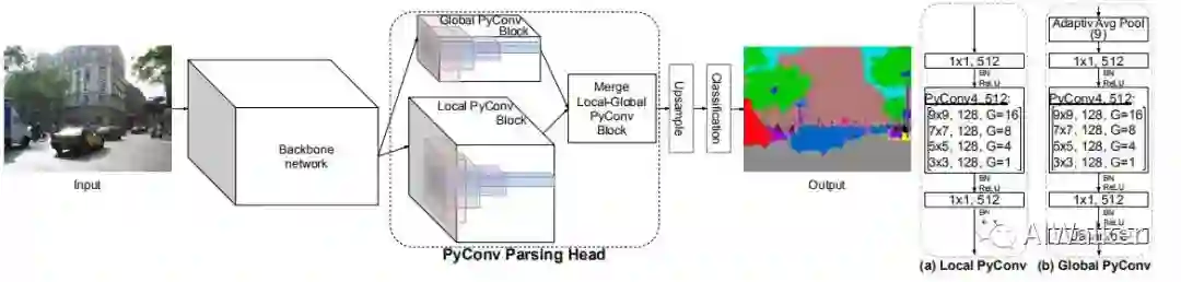 上图给出了所提PyConv在语义分割中的应用形式,作者所设计的Head同时进行局部与全局信息提取并采用了另外的一个模块进行信息集成,讲这种Head称之为PyConvPH。PyConvPH包含三个主要成分:
