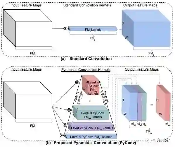 该文提出一种金字塔卷积(Pyramidal Convolution, PyConv),它可以在多个滤波器尺度对输入进行处理。PyConv包含一个核金字塔,每一层包含不同类型的滤波器(滤波器的大小与深度可变,因此可以提取不同尺度的细节信息)。除了上述提到的可以提取多尺度信息外,相比标准卷积,PyConv实现高效,即不会提升额外的计算量与参数量。更进一步,它更为灵活并具有可扩展性,为不同的应用提升了更大的架构设计空间。