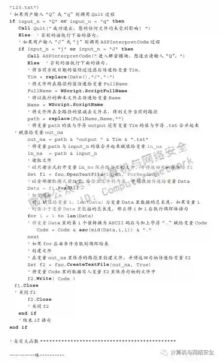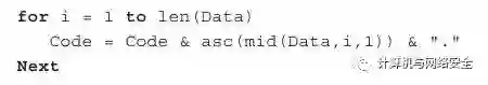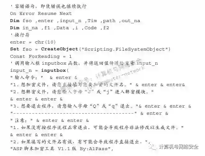 这段代码的意思就是将变量Data里的内容全部转换为ASCII码,那么它如何运行呢?可以新建一个文本文档,在里面输入相应代码后,再将其.txt后缀名更改为.vbs即可。当然了,仅凭以上那一小段代码还是运行不起来的。为此编写了一个加密程序,并在关键的地方为大家进行了相应的解释,方便大家的学习和使用,代码如下:
