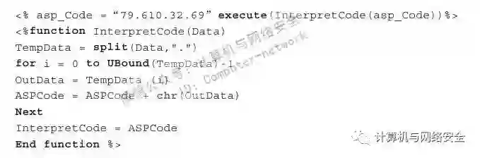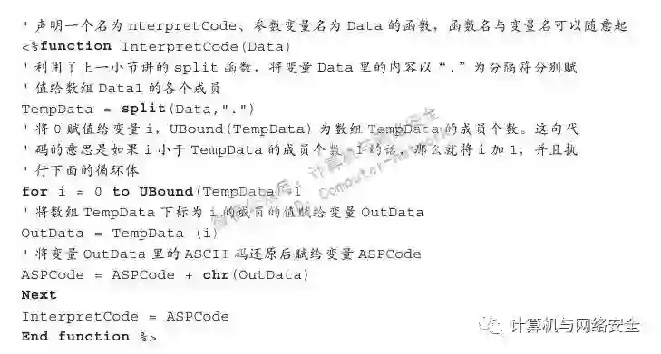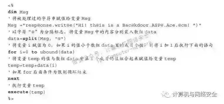 首先变量Msg里包含了一个加密的可执行ASP语句response.write("Hi!this is a Backdoor.ASP.Ace.cm!"),它的作用就是打印"Hi!this is a Backdoor.ASP.Ace.cm!"这个句子,但是我们发现源程序中的句子已经被做了处理,其中被随意插入了许多“@”号,我们就当它是已经加密的木马文件。利用Split函数将变量Msg里加密的ASP语句以“@”号为分隔符分别存入数组data里,由于已加密的ASP语句里有6个“@”,因此它们被当成了7个不同的成员保存在数组data里。接下来就是以一个for循环语句解密,循环条件里的变量i被设为数组的下标,用来代表数组里的不同成员,后面的ubound(data)则返回数组data的成员个数,并且每执行一次,i的值就加1。循环体的内容是将数组data里下标为i的成员里的数据附加给变量temp,假设原来temp里的内容为resp,且下标为1的成员里的内容为onse.writ,那么执行完毕后temp的内容便为response.writ了。由此不难看出,这个循环语句的作用就是将数组里的所有成员所保存的内容都一一“吐”给变量temp。