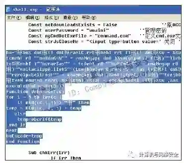 当我们拿到一个脚本木马时需要先将它“切割”,也就是将里面的代码分成几部分,然后分别保存到文本文档里,并将扩展名改为.asp,最后使用杀毒软件查杀。如果哪个文件被杀,就说明它里面含有特征码,那么我们就将这个被杀的文件再次进行分割,然后查杀,如果还有被杀的文件,那么就再次重复这一过程,直到发现里面的特征码为止。