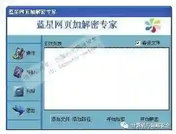 打开软件后先单击“操作”按钮,如图11所示。然后单击“添加文件”按钮添加要加密的HTML文件,如果需要批量转换的话,还可以单击“添加路径”按钮。选择好后再单击“开始加密”按钮就行了。